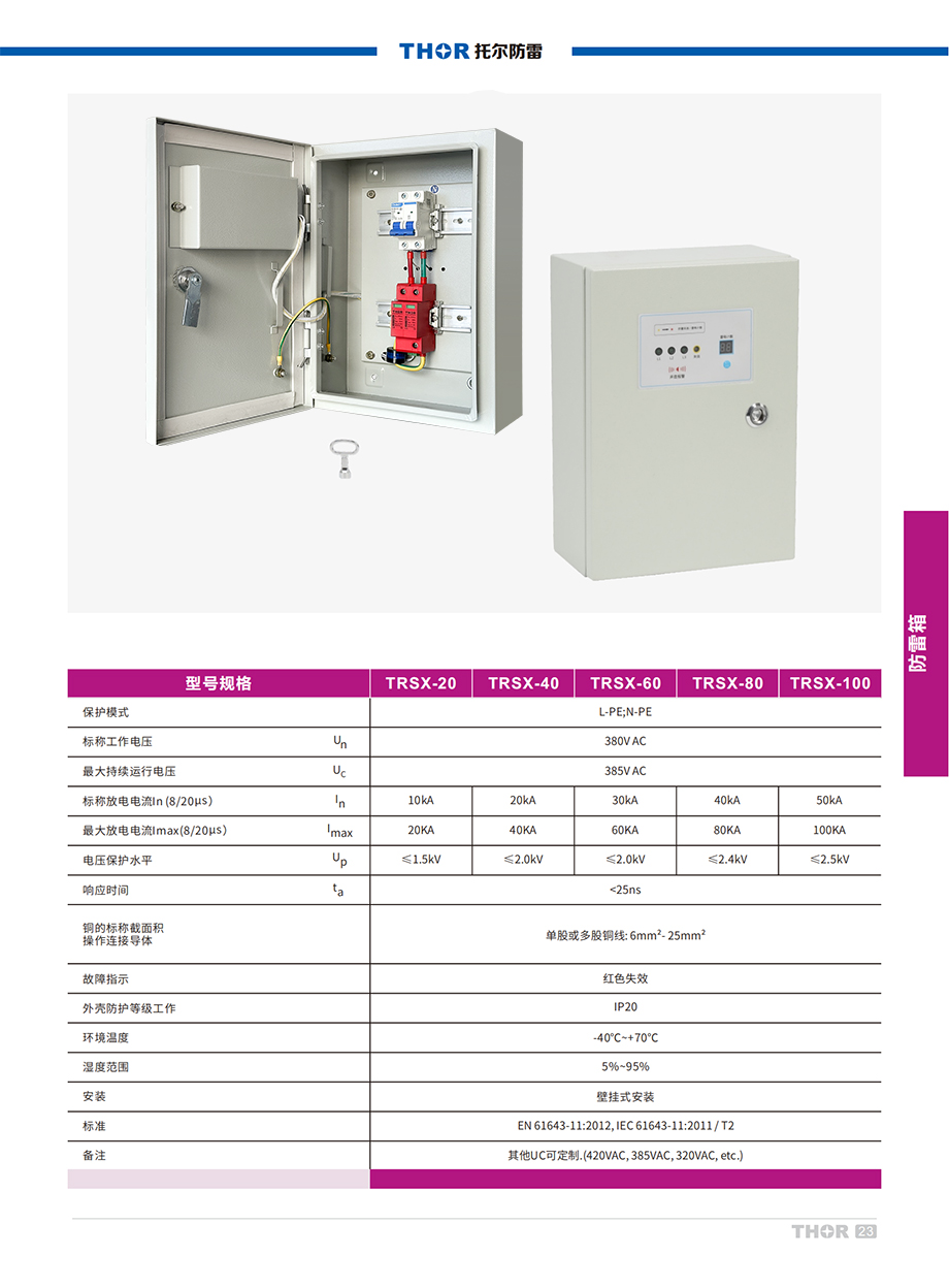 TRSX系列電源防雷箱主要用于氣象、交通、郵電、計(jì)算機(jī)網(wǎng)絡(luò)、電力、住宅配電箱、鐵路等領(lǐng)域使用。電源防雷分為B、C、D三級,依據(jù)IEC(國際電工委員會)分區(qū)防雷、多級保護(hù)的理論,B級防雷屬于第一級防雷器,可應(yīng)用于建筑物內(nèi)的主配電柜上:C級防雷屬第二級防雷器,應(yīng)用于建筑物的分路配電柜中;D級防雷屬于第三級防雷器,TRSX防雷箱有效抑制來自交流電源線路上侵入的感應(yīng)雷電波,從而保護(hù)用電設(shè)備免遭感應(yīng)雷擊和靜電破壞。