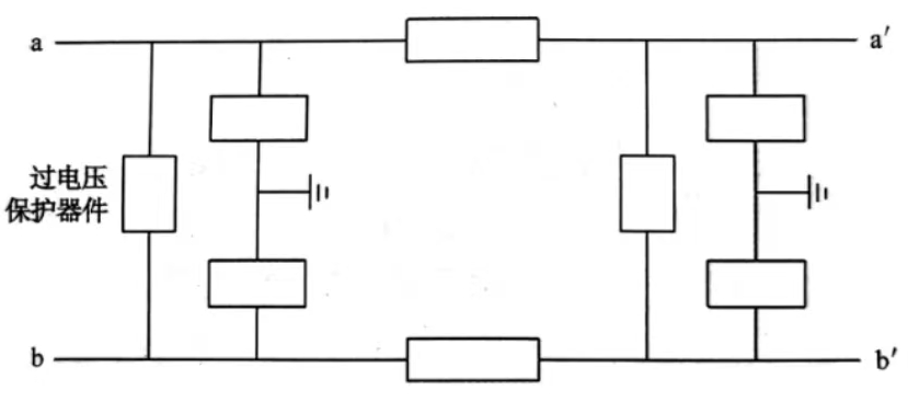 一般雙絞線、平行線對(duì)的兩個(gè)信號(hào)線對(duì)地完全均衡,所以它們的防雷要求也是完全一樣的,而且多對(duì)平行線的防雷與一對(duì)平行線的原理完全相同,如圖2-1 所示。對(duì)于一對(duì)平行的通信線路,一般要求任意導(dǎo)線對(duì)大地、導(dǎo)線與導(dǎo)線之間都需要考慮防雷保護(hù)要求。對(duì)于那些連接精密設(shè)備、防雷要求高的平行線對(duì),還要考慮多級(jí)防雷電路。