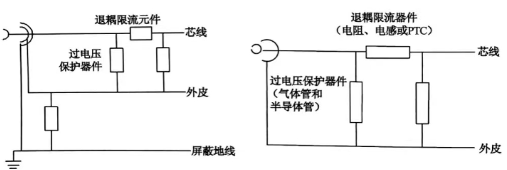 普通同軸線只有金屬芯線與金屬外皮層,這類同軸線的防雷保護(hù)主要集中在芯線與金屬外皮層之間。也有的同軸線在芯線和金屬外皮層外還有一層接地屏蔽層,這種同軸線的防雷除了芯線與外皮層之間外,還需要在外皮與屏蔽層之間采取防護(hù)措施。同軸線的避雷原理如圖2-2所示。