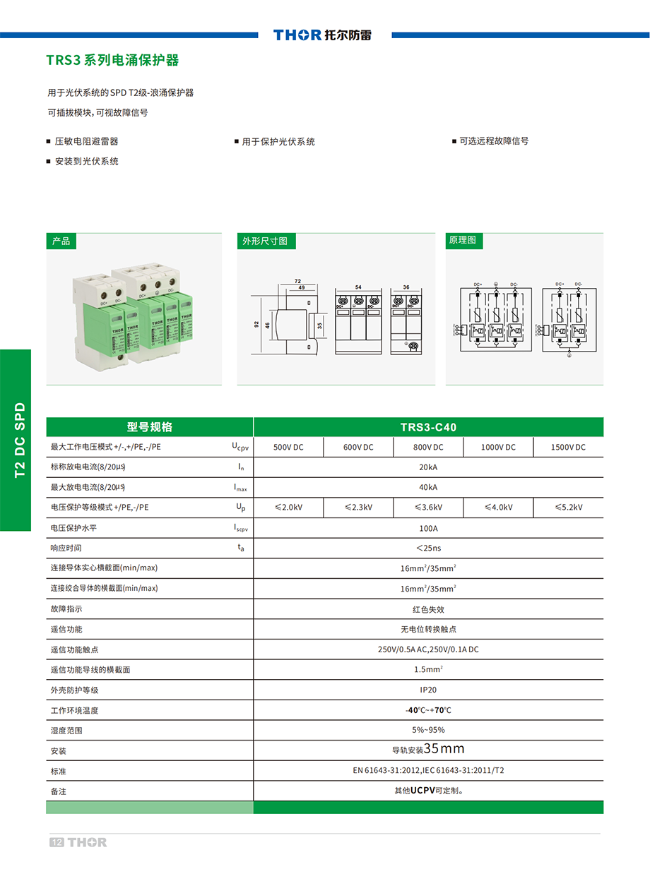 TRS3系列電涌保護(hù)器適用于新能源太陽(yáng)能光伏發(fā)電系統(tǒng)或其他直流電源系統(tǒng)的防雷保護(hù),最大持續(xù)工作電壓DC500V、800V、1000V。安裝位置在直流電路總電源系統(tǒng)中,對(duì)間接雷電流、直接雷電流或其它瞬間過(guò)電壓進(jìn)行保護(hù)。