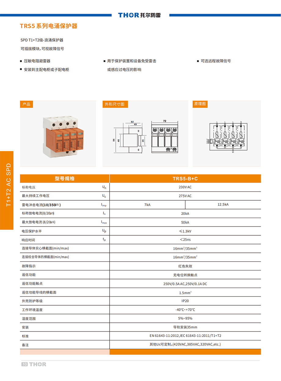 TRS5系列電涌保護(hù)器(以下簡(jiǎn)稱(chēng)SPD)適用于交流50/60Hz,額定電壓至380V的IT、TT、TN-C、 TN-S、TN-C-S,等供電系統(tǒng),對(duì)間接雷電和直接雷電影響或其他瞬時(shí)過(guò)電壓的電涌進(jìn)行保護(hù)。